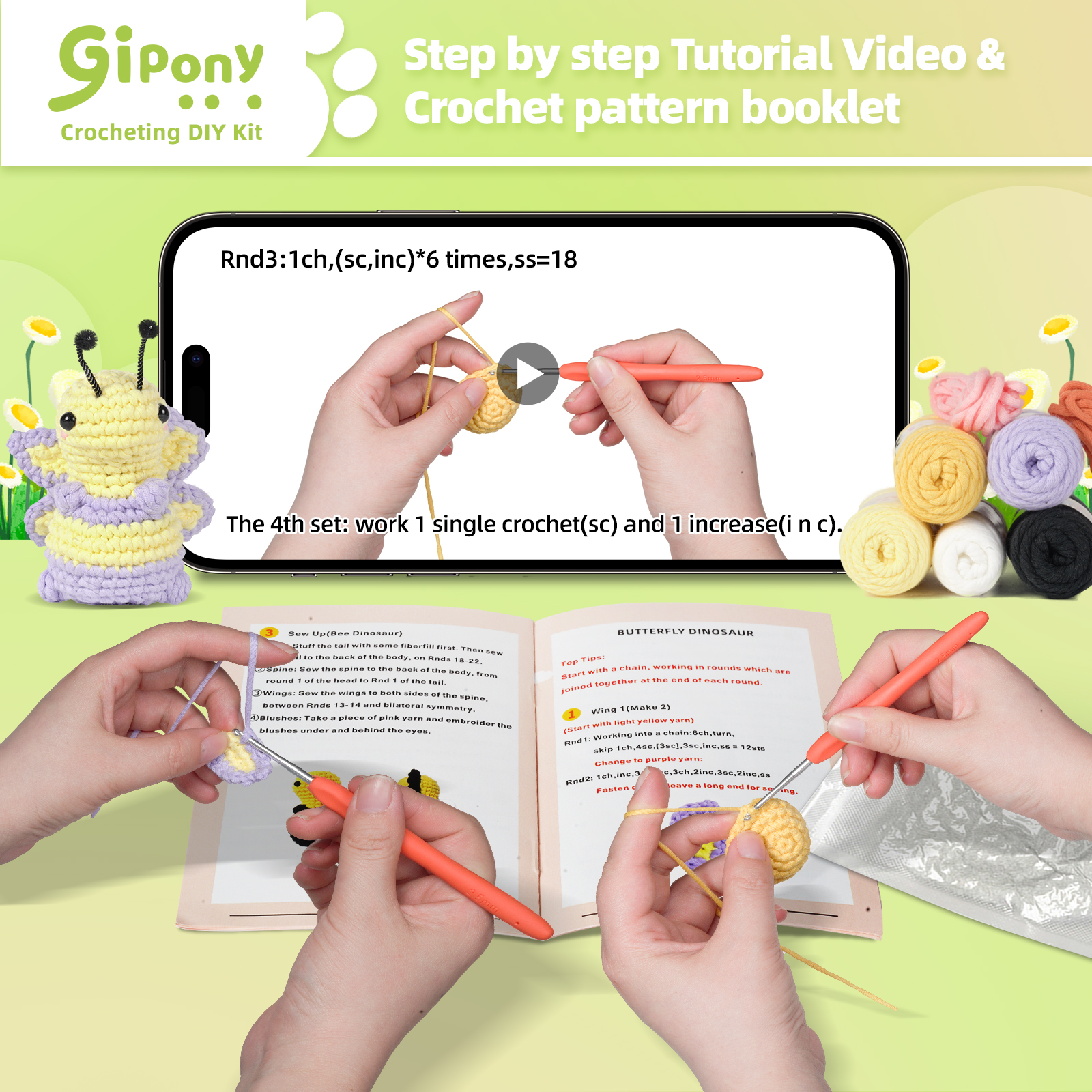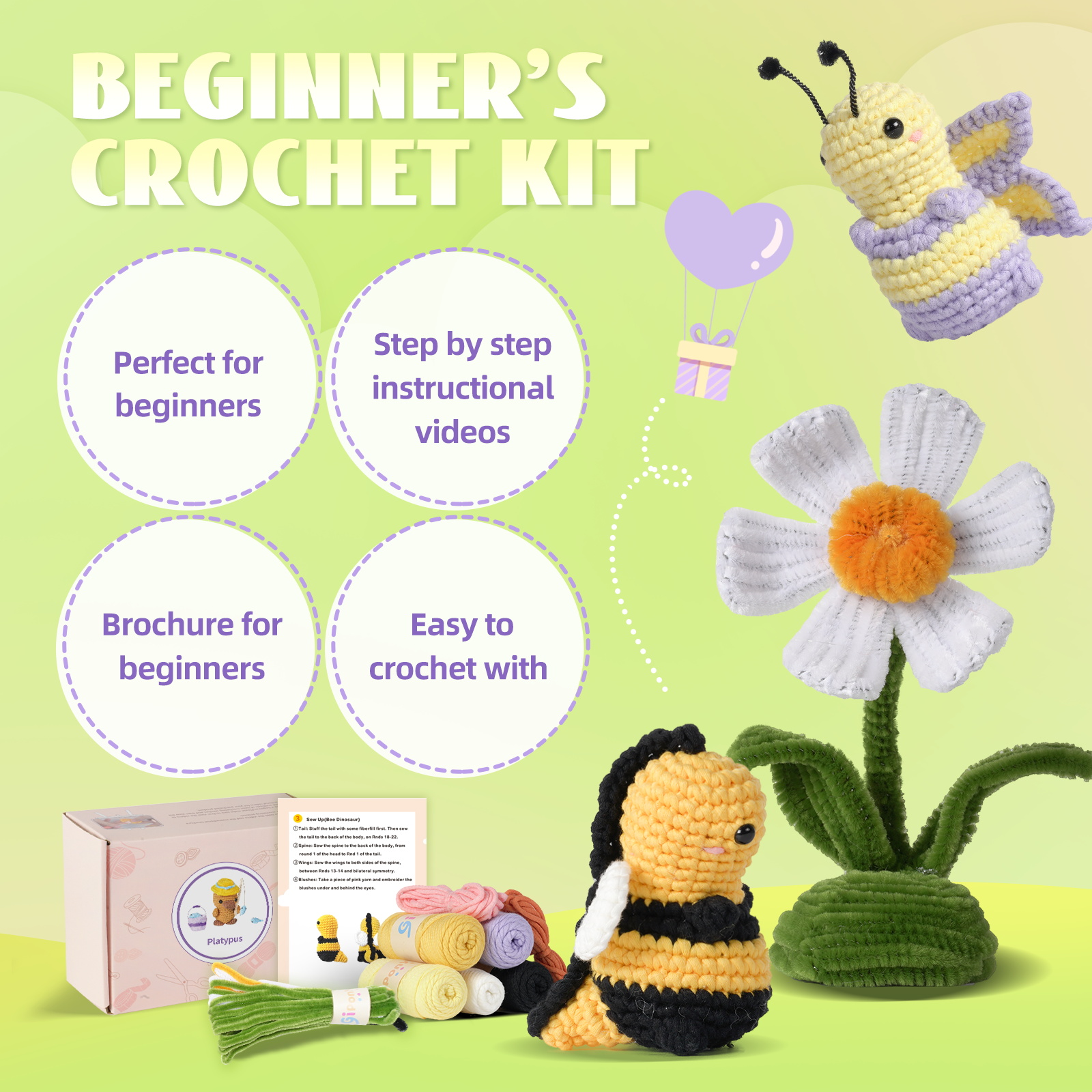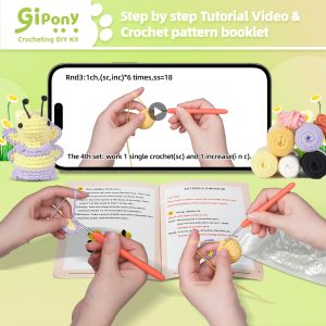 🛍️ Kit Includes All You Need – This crochet kit for beginners has an ergonomic crochet hook, beginner-friendly yarn, stitch markers, safety eyes, blunt needle, stuffing, PDFs, and video instructions.