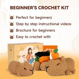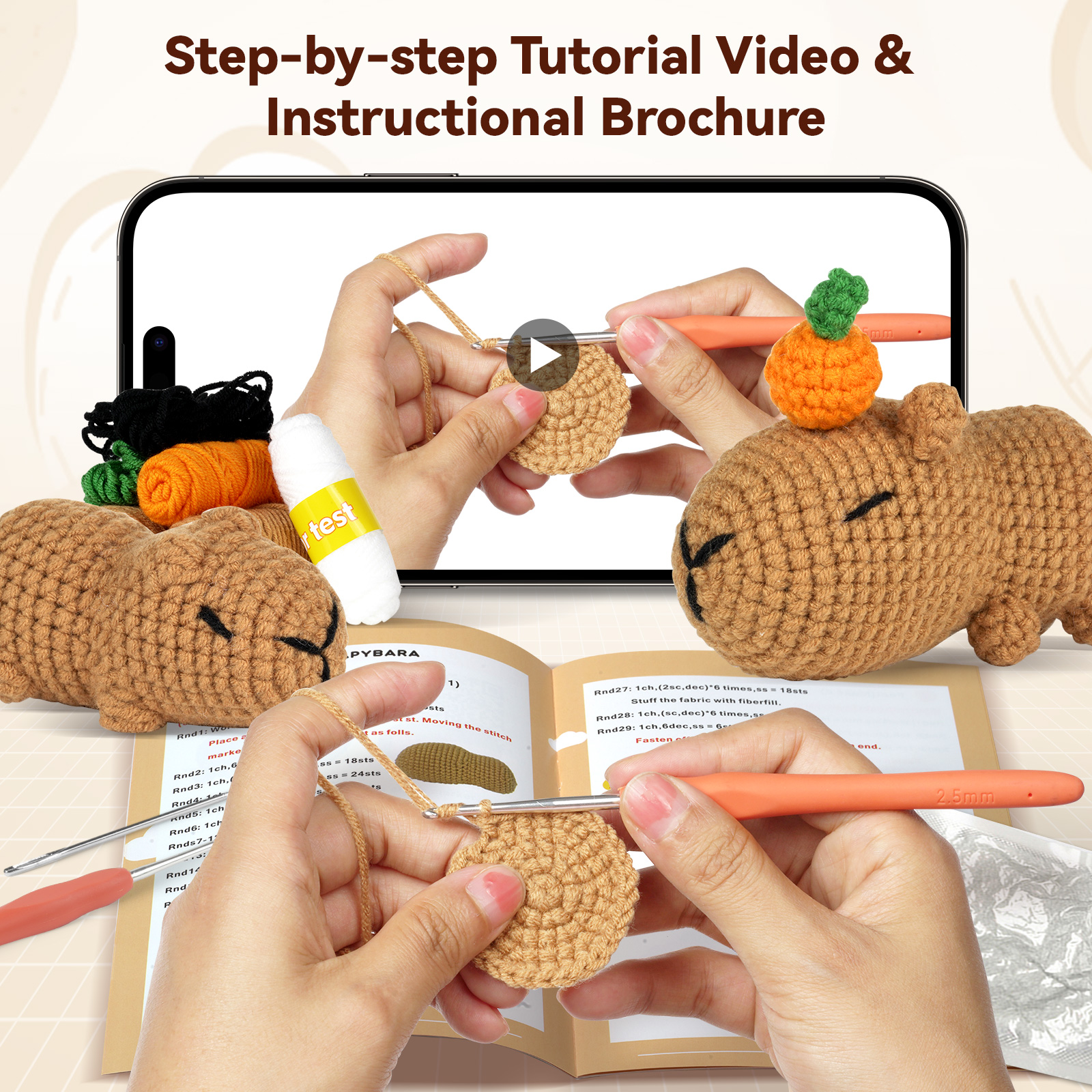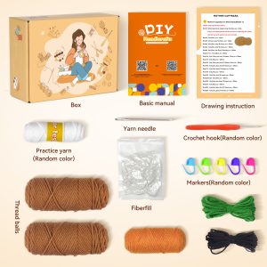 🛍️ Kit Includes All You Need – This crochet kit for beginners has an ergonomic crochet hook, beginner-friendly yarn, stitch markers, safety eyes, blunt needle, stuffing, PDFs, and video instructions.