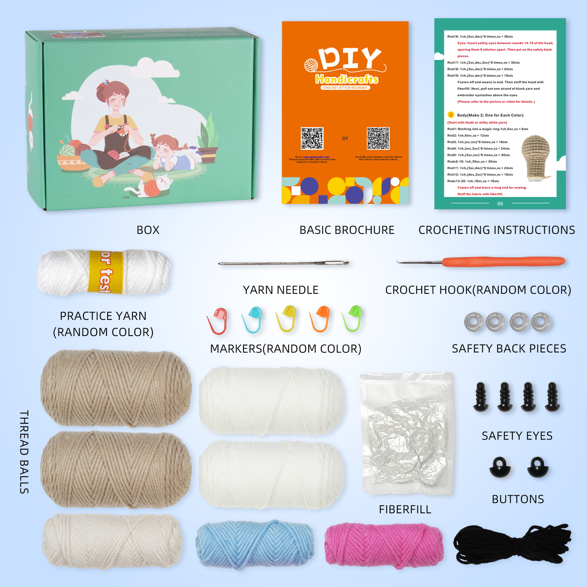 🛍️ Kit Includes All You Need – This crochet kit for beginners has an ergonomic crochet hook, beginner-friendly yarn, stitch markers, safety eyes, blunt needle, stuffing, PDFs, and video instructions.