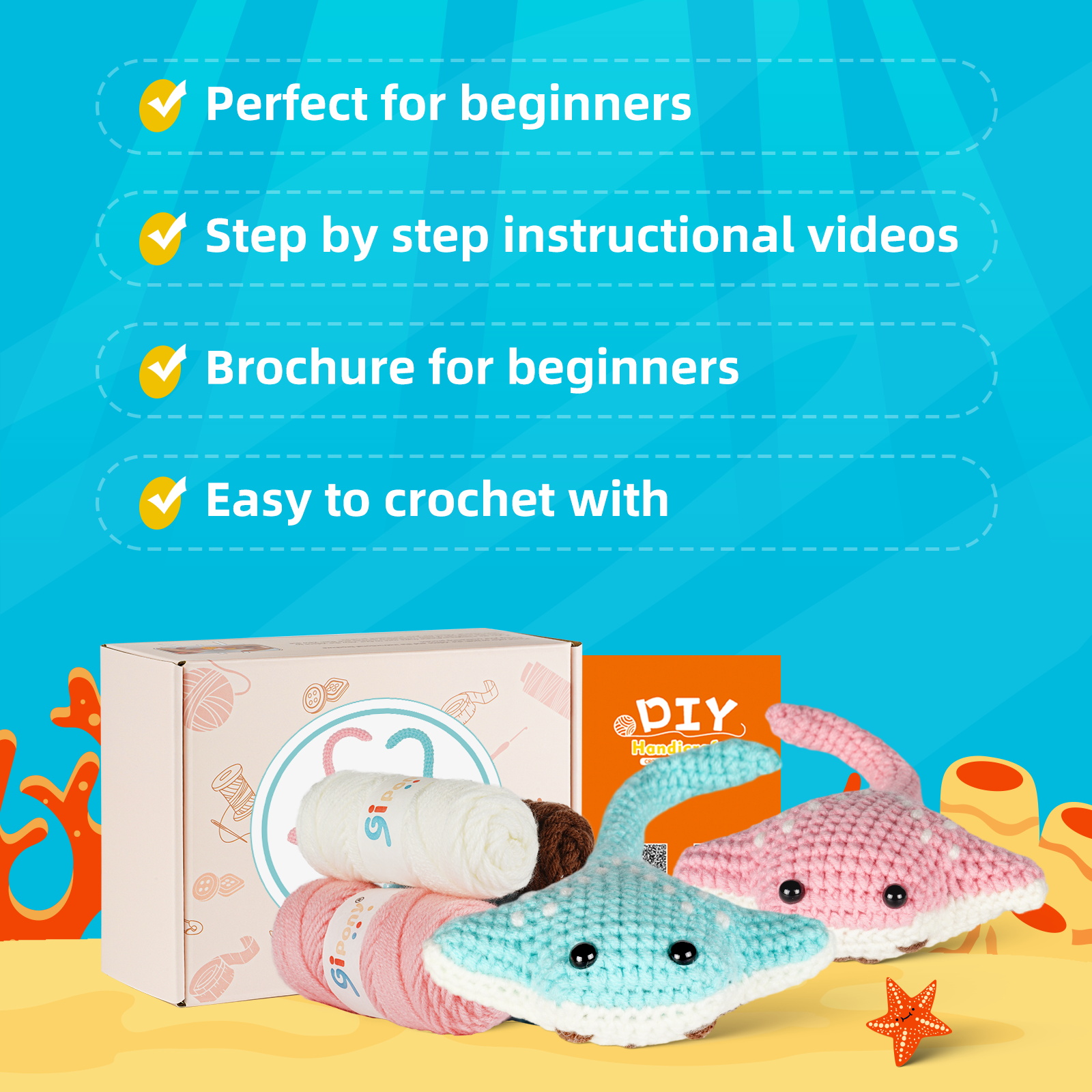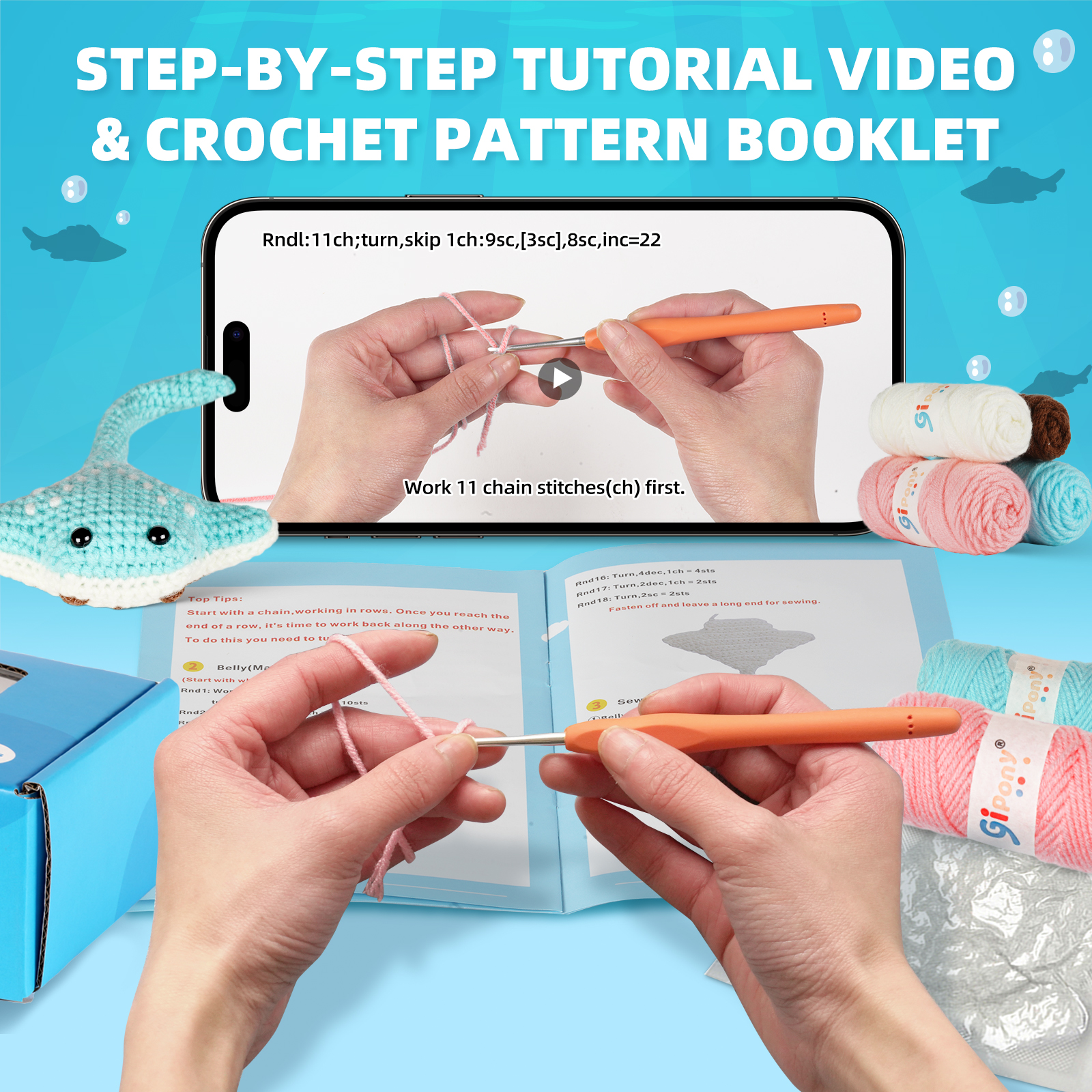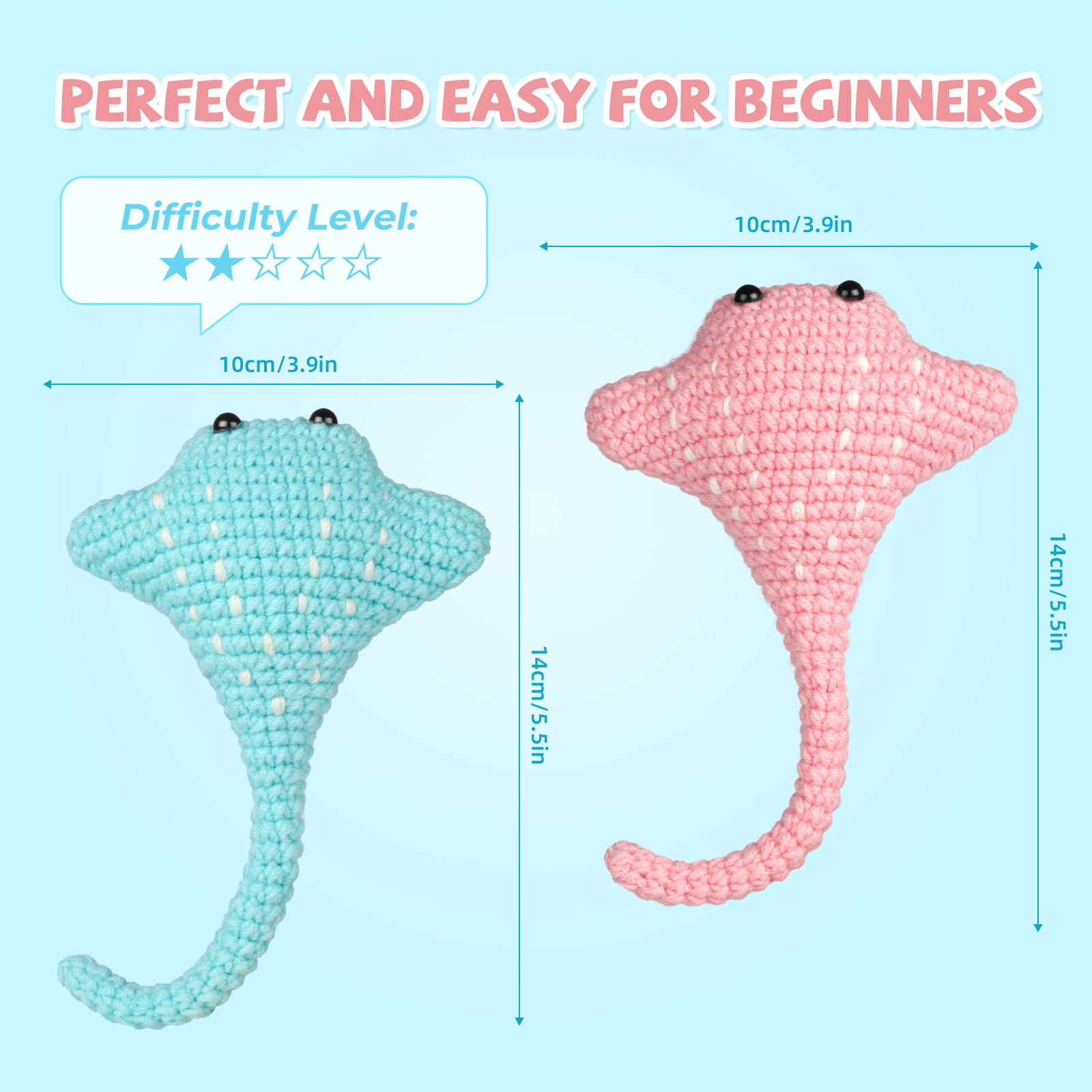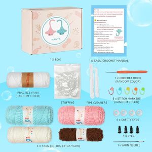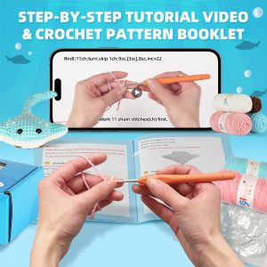 🛍️ Kit Includes All You Need – This crochet kit for beginners has an ergonomic crochet hook, beginner-friendly yarn, stitch markers, safety eyes, blunt needle, stuffing, PDFs, and video instructions.