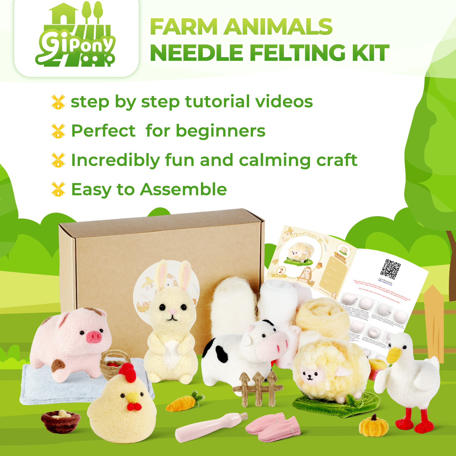 🛍️ Kit Includes All You Need – This needle felting kit for beginners comes with a variety of wool roving in vibrant colors, felting needles, foam pad, safety eyes, finger guards, and detailed instructions in both PDF and video format. Everything you need is in one box to get started right away!